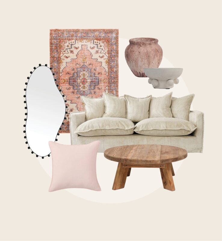 Adairs World’s Softest Byron Washable Rug 200x300cm $499.99, Eureka Furniture Farmhouse Round Table $574.50, Freedom Mist Corduroy Sofa $2,069, Freedom Polina Decorative Bowl $39.99, James Lane Lyon Wall Mirror $249, James Lane Madison Pot $39.95, Sheridan Outlet Shaws Cushion $49.99.