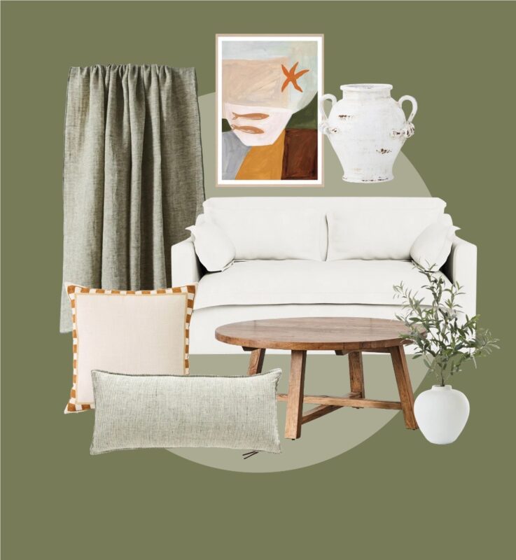 Adairs Azul Cushion $59.99, Adairs Olive Stem in Vase $129.99, Freedom Retreat Fabric Sofa $2,999, OZ Design Abstract Tabletop 1 Collection Framed Print $259, Provincial Home Living Bengal Stripe Linen Cushion $139.95, Provincial Home Living Connor Coffee Table $1,199, Provincial Home Living Kylix Urn $139.95, Provincial Home Living Millicent Linen Throw $199.95.